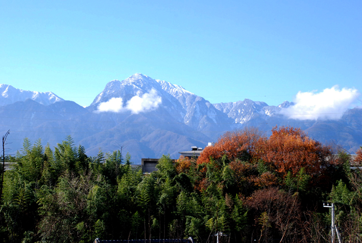 また、清光の墓に詣でたとき、雄大な借景の中の晩秋の色鮮やかな山々の後に一段と高く聳えて